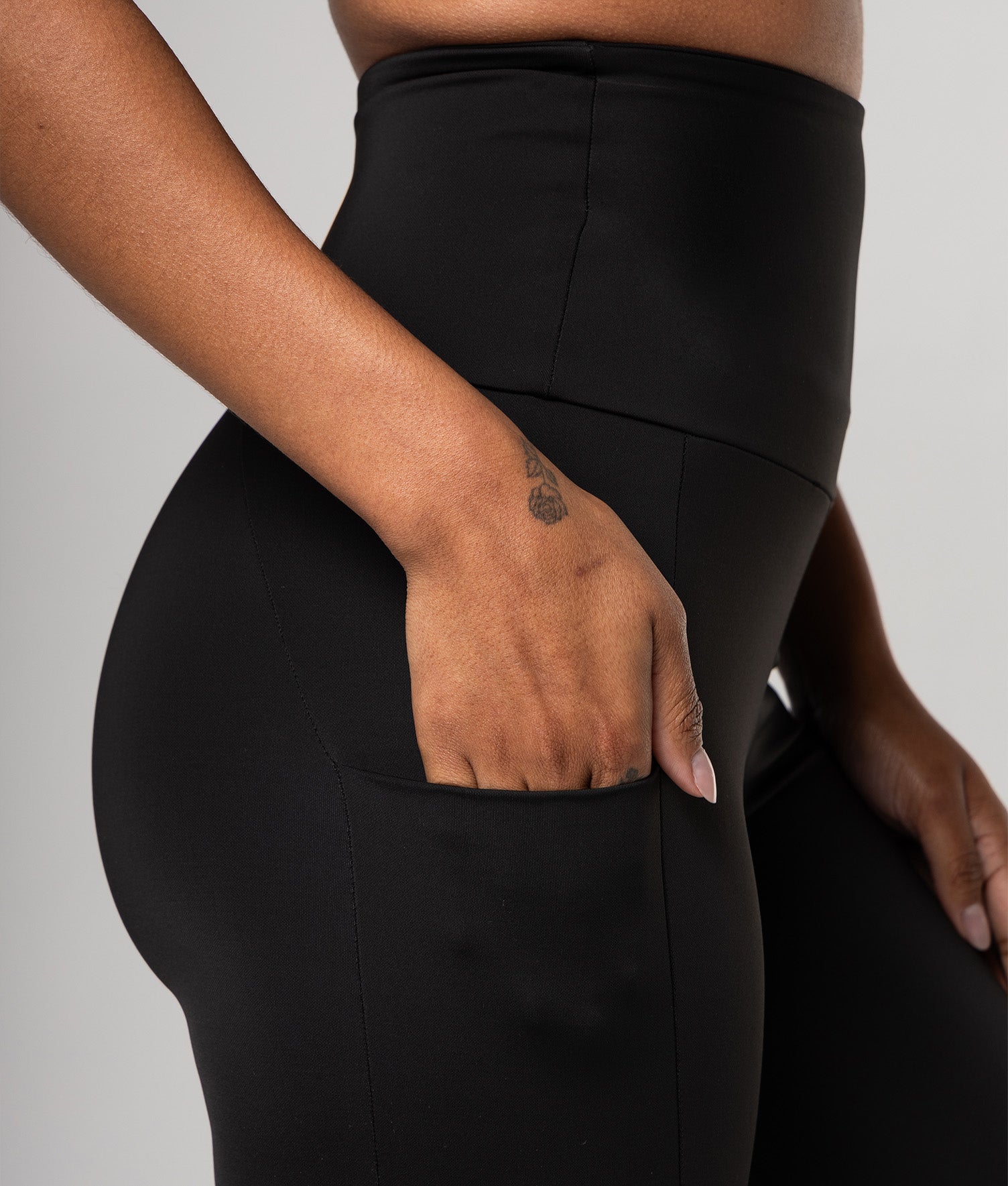 Alta compressão na região da cintura e média compressão na região das pernas.