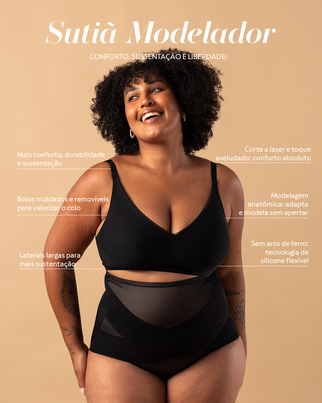 O Sutiã Modelador foi desenvolvido com compressão leve e sustentação média, que se adapta naturalmente ao formato do corpo, modelando os seios com conforto e firmeza.